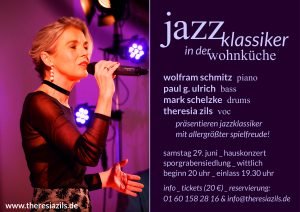 Thomas Bracht (Klavier), Jürgen Kochler (Bass), Thomas Schöfer (Schlagzeug) und Theresia (voc) zelebrieren Jazzklassiker mit allergrößter Spielfreude – aus der Wohnküche wird ein Minikonzertsaal.