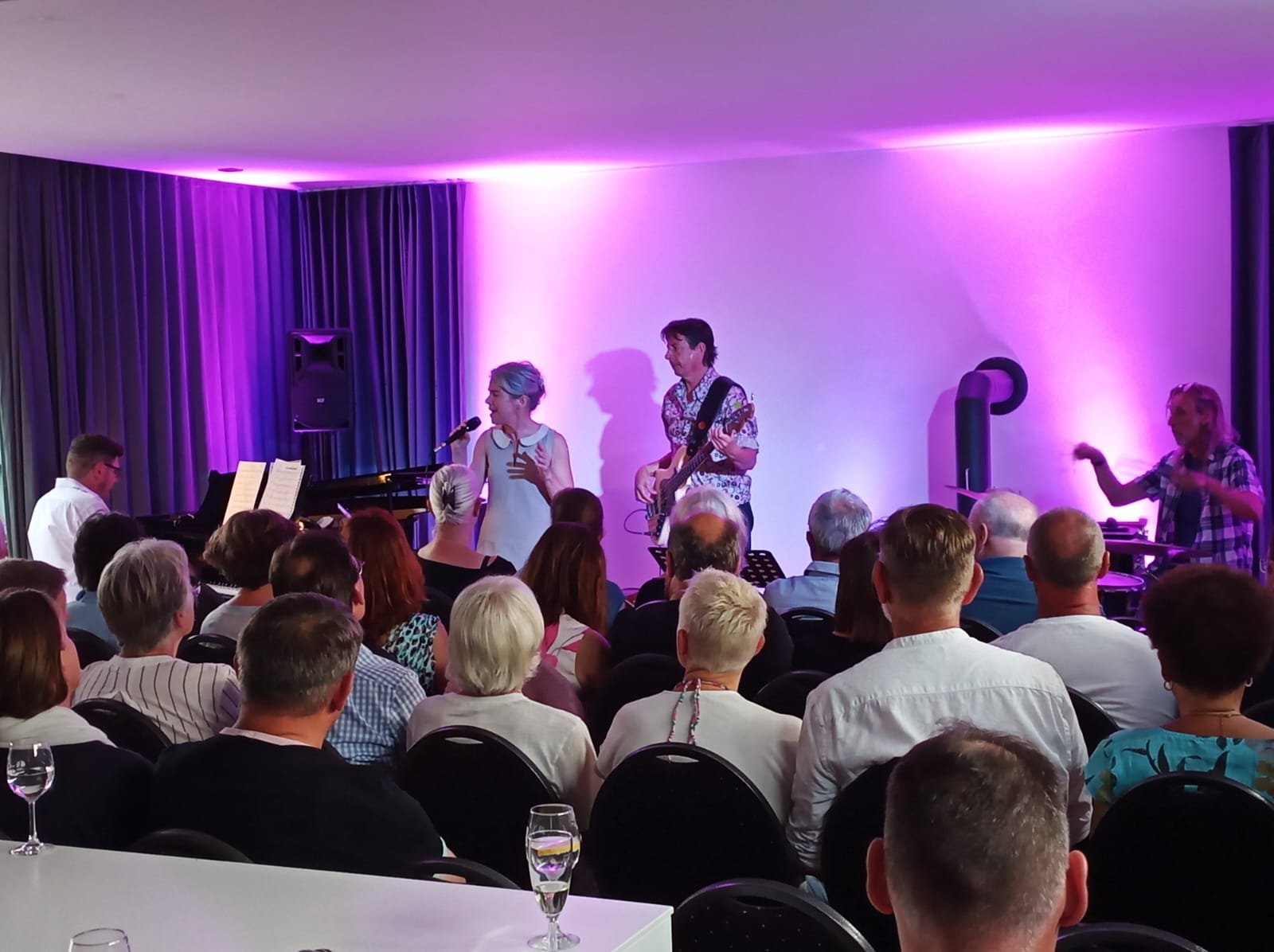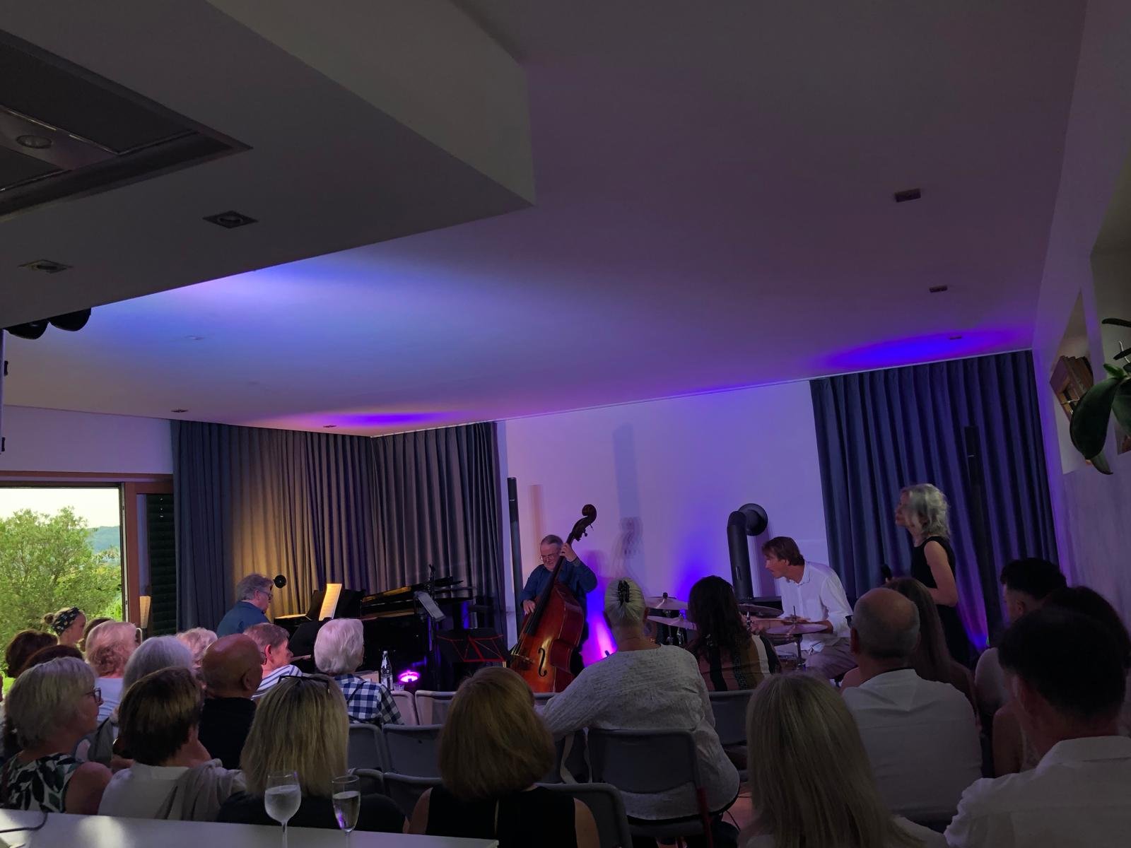 so die Stimmen aus dem Publikum des gut besuchten Wohnzimmers in der Sporgrabensiedlung in Wittlich am Samstagabend, 08. Oktober 2022 beim ersten öffentlichen Wohnzimmerkonzert mit Thomas Bracht (Klavier), Jürgen Kochler (Bass), Thomas Schöfer (Schlagzeug) und Theresia Zils (voc). Durch die hervorragende Raumakustik entstand ein ausgesprochen guter Sound im ausgewogenen Zusammenspiel von Kontrabass & Schlagwerk, Flügel und Stimme. Das Programm gestaltete sich abwechlungsreich. Die intime Atmosphäre im besonderen Ambiente gab Gästen die Gelegenheit zur musikalischen Begegnung – bei einem Glas Wein oder Sekt vom Weigut Losen-Bockstanz in Wittlich sowie einem schönen Ausklang für alle nach dem Konzert.